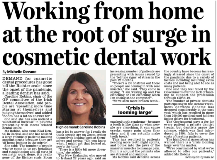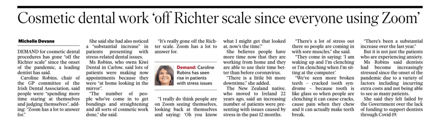 March 28 – Irish Independent – ‘Zoom has a lot to answer for’ – cosmetic dental work ‘off the Richter scale’ since onset of Covid