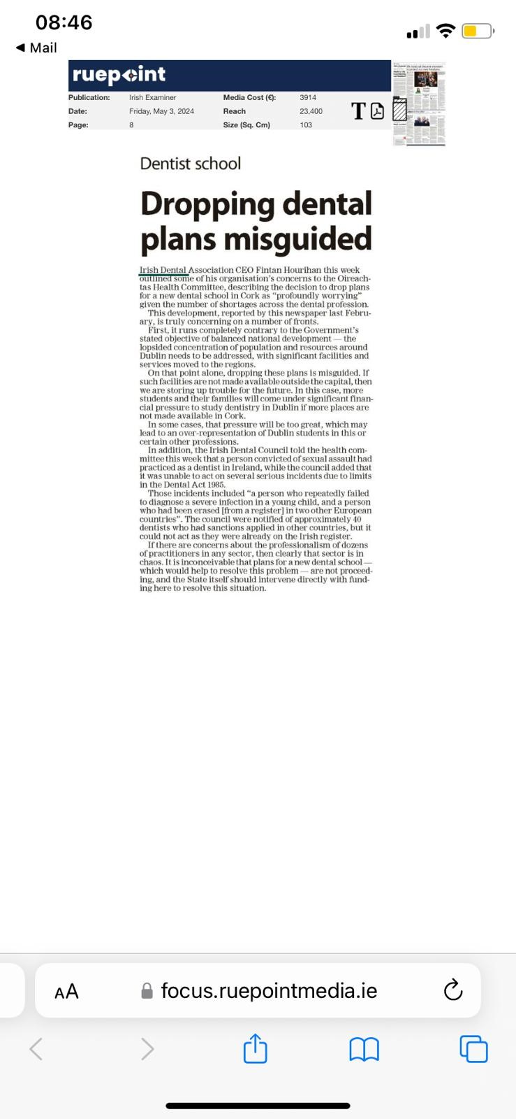 October 4 – Irish Examiner – Dental schools starved of funding